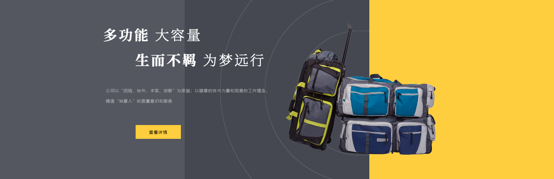 本公司是一家集設(shè)計(jì),制造,加工,貿(mào)易為一體的專(zhuān)業(yè)箱包生產(chǎn)出口企業(yè)。已有20多年箱包生產(chǎn)經(jīng)驗(yàn)。公司廠區(qū)位于中國(guó)浙江省海寧市鹽官工業(yè)園區(qū),占地15000平方米,建筑面積10000平方米,員工150人,年生產(chǎn)能力260萬(wàn)只(套)。 公司以尼龍,滌淪,牛津布,P...